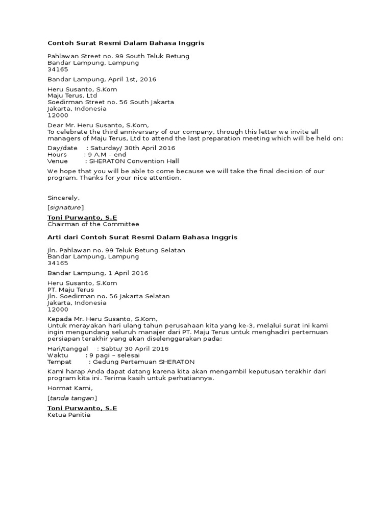 Contoh surat pribadi dalam bahasa inggris surat menyurat telah menjadi bagian hidup manusia sejak dahulu kala. Nah untuk menutupi kebutuhan tersebut maka seseorang harus memiliki pekerjaan dan bisa mendapatkan penghasilan. Contoh surat bisnis dalam bahasa inggrissurat bisnis adalah surat yang digunakan baik perseorangan instansi ataupun lembagaga organisasi yang isinya untuk menyampaikan pesan pesan bisnis secara tertulis dengan menggunakan media tertentu baik via pos faksimili maupun media internet. Contoh undangan resmi dalam bahasa inggris. Nah berikut ini kami hadirkan beberapa contohnya untuk sahabat semua sekaligus beserta juga dengan artinya. Contoh surat resmi dalam bahasa inggris.
