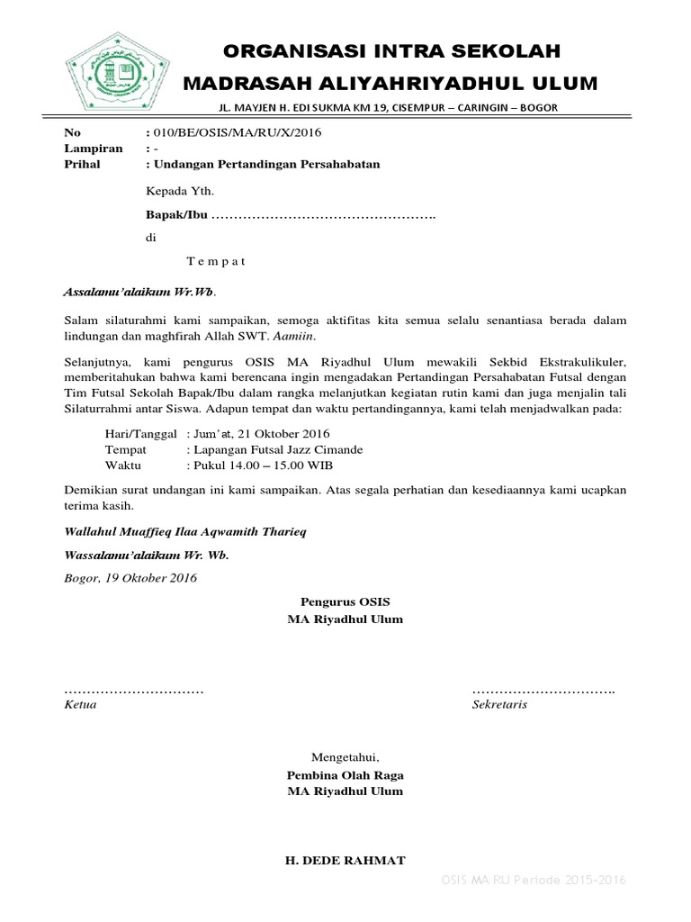 Contoh surat resmi osis. Karena undangan rapat osis merupakan salah satu surat resmi anda tentu saja harus mengikuti beberapa kaidah dalam pembuatan surat resmi. 15 contoh surat resmi tentang osis dalam bahasa sunda yang baik 2019. Contoh surat resmi tentang osis dalam bahasa sunda in addition it will feature a picture of a sort that may be observed in the gallery of contoh surat resmi tentang osis dalam bahasa sunda. Oleh karenanya sebelum mengulas tentang contoh dari surat undangan resmi osis tidak ada salahnya anda memahami beberapa hal dalam format penulisan surat resmi misalnya udangan rapat osis. Dan seperti pada surat resmi pada umumnya surat resmi osis juga didalamnya harus memakai bahasa resmi yang baik baku dan bahasa yang sesuai eyd bahasanya singkat jelas dan padat serta terdapat nomor surat kop surat lembaga organisasi yang membuatnya tanda tangan serta cap basah. Dilihat dari segi penulisan maka untuk contoh surat undangan tidak resmi ini tidak memiliki aturan aturan baku seperti pada surat resmi.