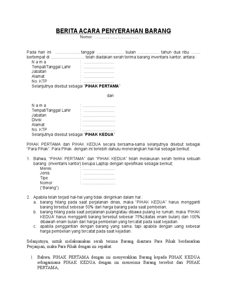 Kasag 0mm dan kangan fa1ltas kshatan masara1at 0ni2r sitas andalas padang slan3tna dist pihak pertama nama. Contoh surat serah terima barang dalam kegiatan perpindahan barang tentu saja memerlukan sebuah bukti sah yang dapat dipertanggung jawabkan ke depannya seperti surat serah terima barang. Berita acara serah terima barang. Untuk meningkatkan performa kelancaran pelaksanaan pekerjaan dari karyawan pt indo food sejahtera maka terhitung sejak tanggal 5 maret 2019 pt indo food sejahtera telah melakukan serah terima inventaris perangkat laptop milik perusahaan dengan spesifikasi sebagai berikut. Surat serah terima adalah surat yang menyatakan tentang serah terima satu barang atau dokumen bahkan juga kadang kadang dipakai saat berlangsung hand over satu pekerjaan lantaran pergantian jabatan. Contoh surat serah terima barang inventaris.
