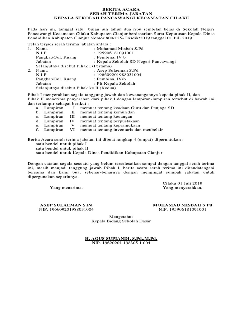 Contoh surat serah terima jabatan kepala sekolah. Contoh format berita acara serah terima jabatan kepala sekolah sertijab ini merupakan salah satu perangkat administrasi sertijab yang diperlukan. Ada banyak hal yang harus disiapkan saat serah terima jabatan ini salah satunya adalah surat serah terima jabatan. Dalam ulasan ini anda akan menemukan kumpulan contoh surat undangan serah terima jabatan sertijab tahun 2020 terbaru siap cetak print dan siap edit. Kecamatan sragi pada hari ini senin tanggal tiga puluh bulan mei tahun dua ribu lima di sekolah dasar negeri purworejo 02 kecamatan sragi kabupaten pekalongan berdasarkan surat keputusan bupati nomor. Berita acara serah terima jabatan kepala sekolah dasar negeri purworejo 02 unit pelaksana teknis dinas pendidikan. Contoh surat berita acara serah terima jabatan kepala sekolahmadrasah sahabat abdan pada pertemuan kali ini saya kembali akan membagikan contoh surat yaitu surat berita acara serah terima jabatan kepala sekolah atau madrasahsurat berita acara ini biasanya ditulis ketika terjadi pergantian kepala sekolah madrasah.