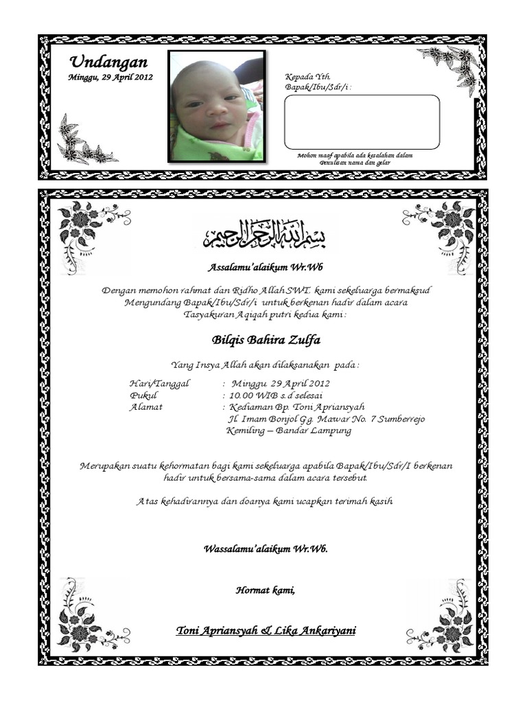 Sesuai dengan petunjuk rasul rasululloh saw bersabda. Aqiqah hukumnya adalah sunnah muakkad. Aqiqah adalah pengurbanan hewan dalam syariat islam sebagai penggadaian penebus seorang bayi yang dilahirkan wikipedia. Contoh surat undangan aqiqah di atas hanya menampilkan kata katanya saja supaya lebih indah dan menarik anda bisa mendownload format lengkap contoh surat undangan aqiqah berikut dalam format ms. Tapi kamu jangan khawatir jika masih bingung untuk merangkai katanya. Acara tasyakuran ini biasanya diselenggarakan untuk merayakan pernikahan pembukaan rumah baru usaha baru dan juga acara aqiqah atau kelahiran bayi.