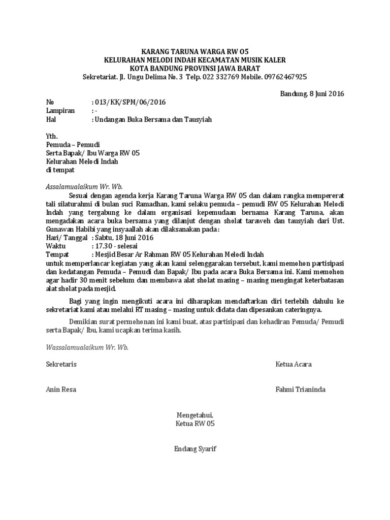 Contoh surat undangan buka bersama. Informasi undangan yang kami bagikan semoga menjadi informasi terbaik dan bisa benrmanfaat untuk semua khususnya informasi tentang contoh surat undangan buka bersama terbaru 2019 yang semuanya kami kumpulkan dengan serapih mungkin. Mohon maaf apabila banyak kesalahan dalam penulisan artikel atau informasi tersebut yang ada kaitannya dengan template. Kemudian klik link dowload yang dibawah postingan ini. Jangan ragu kontak ke banner yang terdapat di sebelah agar mendapatkannya. Dikarenakan banyaknya acara buka bersama pada bulan ini ada beberapa orang yang terlibat dalam kepanitiaan mengalami kebingungan dalam merangkai kata kata undangan buka puasa bersama maka di sini admin ingin berbagi beberapa contoh surat undangan bukber baik yang resmi maupun tidak supaya bisa dijadikan rujukan dalam pembuatannya. 5 contoh undangan buka puasa bersama dalam bahasa inggris beserta arti lengkap bulan ramadhan merupakan sebuah bulan yang istimewa bagi selurug umat islam di dunia karena pada bulan tersebut umat muslim berbondong bondong untuk mengumpulkan pahala dan mengurangi dosa dosa nya.