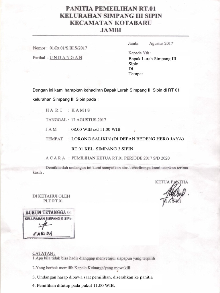 Contoh undangan rapat pemilihan ketua rt saat ini admin bagikan foto contoh undangan rapat pemilihan ketua rt yg admin kira memang cukup keren dengan tema 19 contoh undangan rapat rt terkinigambar kali ini untuk pembaca yang tengah memerlukan konsep kw gambar semoga sesuai dengan yang kamu cari. Undangan tamu seperti ketua rw kelapa dusun kadus dan juga pihak desa atau kepala desa adalah perlu karena tanpa kehadiran mereka sepertinya acara pemilihan ketua rt. 06 periode tahun 2012 2015. Membuat surat undangan tamu. Lampiran perubahan ad koperasi. Yaitu diselenggarakan pemilihan ketua rw dan ketua rt untuk periode 2013 2016.