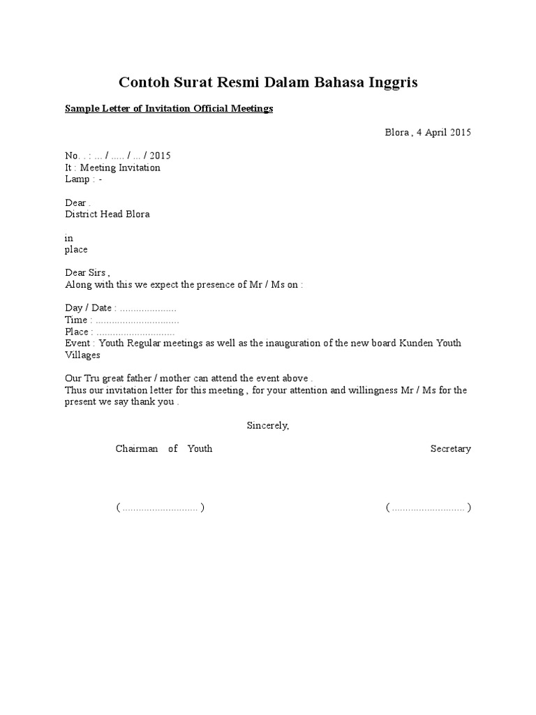 Contoh surat resmi dalam bahasa inggris beserta artinya terbaru apakah sahabat sedang mencari contoh penulisan surat resmi dalam bahasa inggris. 4 contoh surat undangan rapat dalam bahasa inggris undangan biasanya kita dapatkan apabila seseorang mengadakan suatu acara dan kita diharapkan untuk datang ke acara tersebut. Contoh surat resmi dalam bahasa inggris. Ada berbagai macam undangan yang perlu kalian ketahui. Salah satunya adalah undangan rapat. Nah berikut ini kami hadirkan beberapa contohnya untuk sahabat semua sekaligus beserta juga dengan artinya.