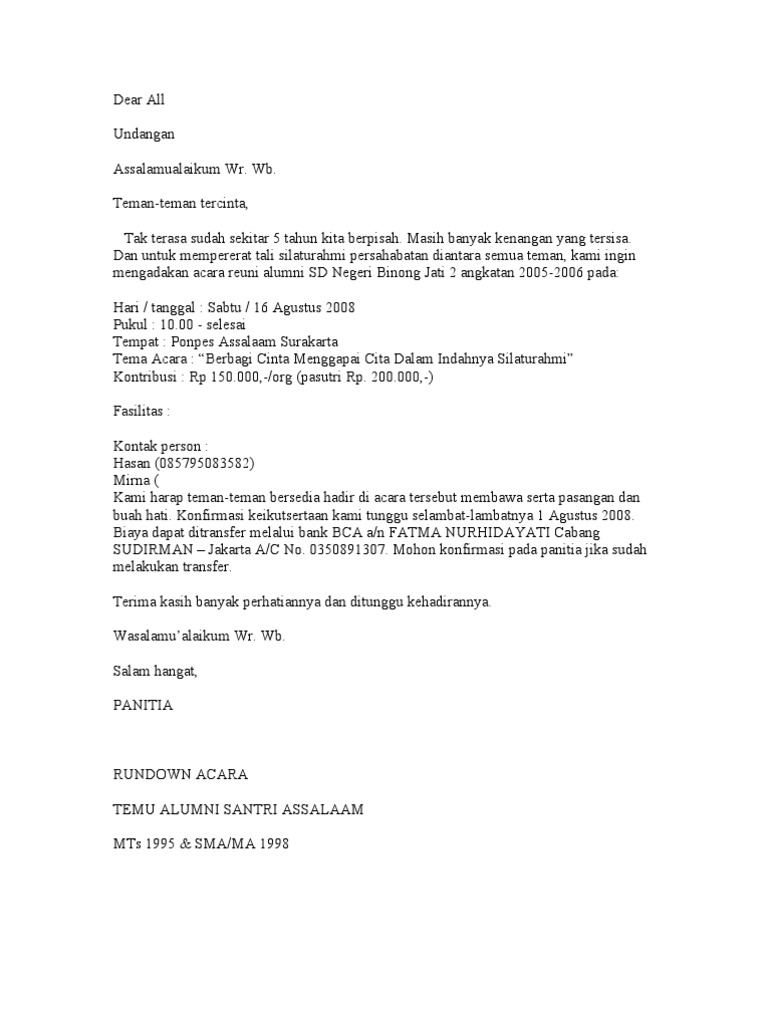 Contoh surat undangan reuni. Contoh surat undangan reuni. Berikut beberapa contoh surat undangan sebagai panduan untuk anda. Pesantren ini memadukan kurikulum pondok current gontor contoh kartu undangan reuni loose download contoh surat undangan formal reuni surat undangan carapedia. Contoh undangan pkk. Apabila ingin mendownload semua file desain undangan pernikahan dan undangan reuni. Contoh undangan reuni pesantren contoh isi undangan.