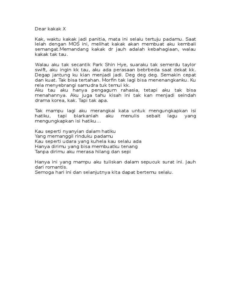 Tapi ada hal yang tidak bisa saya lupakan yaitu ketika kakak memarahi ridwan. Surat untuk kakak kelas osis terlucu hahahaha berikut contoh surat lucu buat sobat yang pengen memberikan surat pada kakak osis yang isi suratnya lucu tapi butuh keberanian yang cukup saya rasa untuk memberikan surat ini kepada kakak osis anda karena mungkin isi surat ini agak menyinggung juga bisa bikin si kk osis malu. Assalamualaikum wrwb maaf sebelumnya kak. Berikut adalah contoh surat untuk kakak osis yang bisa dijadikan rujukan ketika diberi tugas untuk membuat yang seperti itu. Tapi tentu tidak ada salahnya dong selagi anda memang benar benar cinta pada seseorang tersebut seperti kepada kakak osis laki laki anda.