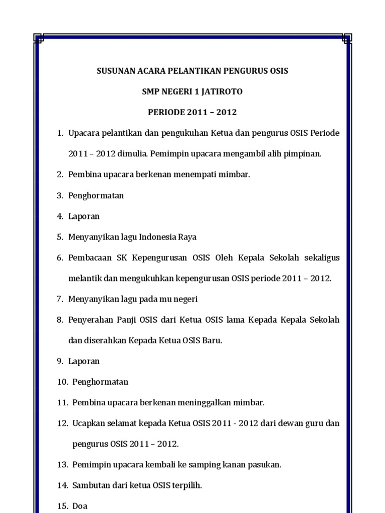Masa bhakti periode tahun 2009 2014. Contoh susunan acara pelantikan osis di sekolah barangkali setiap sekolah sudah melaksanakan pembentukan pengurus osis masa bhakti 2018 2019 ini. Download tata cara pelantikan. Markas cabang forum bersama laskar merah putih. Contoh susunan acara pelantikan pengurus baru mei 7 2011 16 november 1 oktober 6 september 1 januari 8 2010 1 desember 1 total tayangan halaman. Susunan acara sertijab kepala sekolah.
