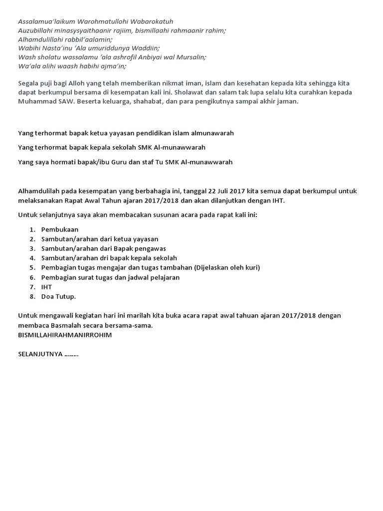Contoh agenda rapat atau meeting. Contoh naskah pembawa acara mc rapat bahasa indonesia pada kesempatan kali ini kami akan memberikan beberapa naskah lengkap untuk pembawa acara rapat bahasa indonesia. Entah itu organisasi kesiswaan kemahasiswaan ataupun organisasi perusahaan. Pertama tama marilah kita panjatkan rasa puja dan puji syukur kehadirat allah swt yang mana pada pagi hari ini kita semua dapat berkumpul bersama dalam acara rapat rutin persit kartika chandra kirana dalam keadaan sehal walafiat. Kadang kala suatu rapat tidak selalu tepat dan terasa membosankan.