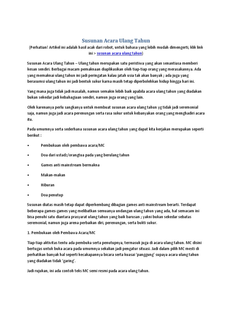 Susunan acara ulang tahun merayakan ulang tahun yang indah baik itu ulang tahun anak ataupun ulang tahun sweet seventeen perlu susunan acara ulang tahun yang juga menarikya susunan acara ulang tahun menjadi penting karena keberlangsungan acara dari awal sampai akhir rundown acara bertumpu pada satu lembar teks tersebut.