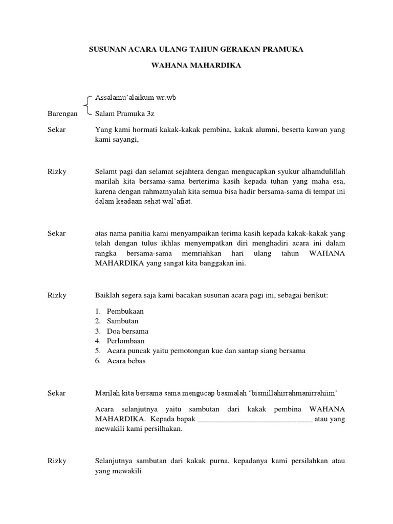 Contoh susunan acara ulang tahun. Contoh susunan acara ulang tahun anak sebagai orang tua merayakan hari ulang tahun anak adalah hal yang lumrah sebagai bentuk tanda kasih sayang kepada si anak juga meramaikannya bersama teman teman si kecil. Keluarga inti terdiri dari ayah ibu dan anak anak saja. Pembukaan yaitu susunan acara ulang tahun dibacakan oleh mc atau orang tua anak tersebut. Dalam pesta ulang tahun pernikahan biasanya lebih ke semi formal. Di karenakan pertumbuhan ekonomi masyarakat yang sudah mencukupi kebutuhan yang lainnya acara ulang tahun sudah biasa untuk di laksanakan. Susunan acara ulang tahun diatas ini dapat digunakan untuk membuat acara perayaan ulang tahun anak usia 1 3 5 7 8 dan 10 tahun.