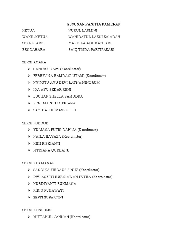 Contoh susunan panitia proposal. Proposal kegiatan adalah sebuah rencana kegiatan yang disajikan ke dalam bentuk rancangan kerja. Apabila terdapat kesamaan nama alamat dan gelar kami mohon maaf yang sebesar besarnya. Dalam proses pembuatan proposal ada beberapa konsep kerja yang dituangkan didalamnya untuk memperoleh target tertentu. Kegiatan ini harus diawali dengan menyusun sebuah proposal kegiatan. Contoh proposal kegiatan adalah suatu rancangan kegiatan yang berlangsung dalam bentuk tulisan dengan sistematis dan terperinci. Misalnya kegiatan desa kampus sekolah atau bahkan penggalangan dana untuk bencana dan lain sebagainya.