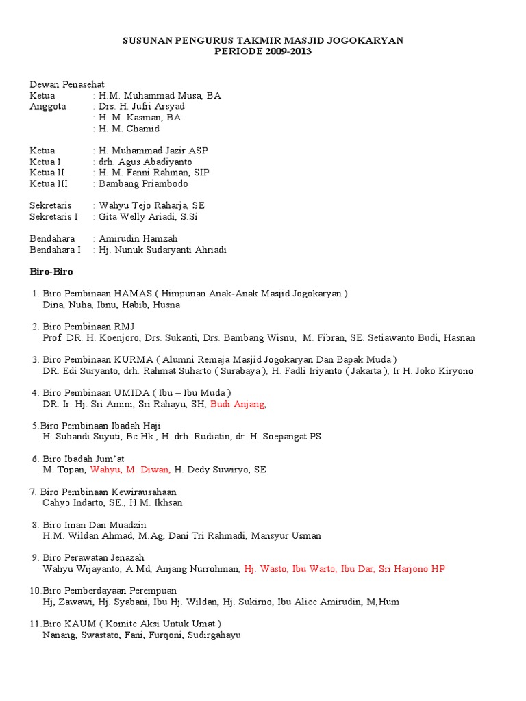 Bahwa untuk meningkatkan pelaksanaan kegiatan program kerja masjid ar rahim dipandang perlu untuk membentuk kepengurusan sampai akhir masa bakti. Contoh susunan pengurus dan job description tamir masjid. Wardi tiarno ketua. Susunan pengurus tamir masjid al muhtadin periode 1 1 2015 sd 31 12 2018. Ketua umum wakil ketua umum sekretaris umum bendahara wakil bendahara i wakil bendahara ii. Gresfi bendahara i.