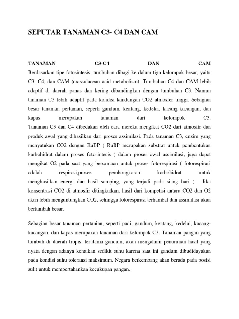 Contoh tanaman c3 c4 dan cam. Sebagian besar tanaman pertanian seperti gandum kentang kedelai kacang kacangan dan kapas merupakan tanaman dari kelompok c3. Tanaman c3 c4 dan cam. Contoh tanaman c3 c4 dan cam tanaman yang termasuk c3 c4 dan cam. Tanaman c3 lebih adaptif pada kondisi kandungan co 2 atmosfer tinggi. Pada uraian tentang fotosintesis yang dulu saya telah jelaskan mengenai proses fotosintesis yang umum terjadi pada tumbuhan. Pada siklus tersebut co 2 akan diikat oleh ribulosabifosfat rubp dan membentuk asam fosfogliserat pga yang merupakan senyawa 3 c.