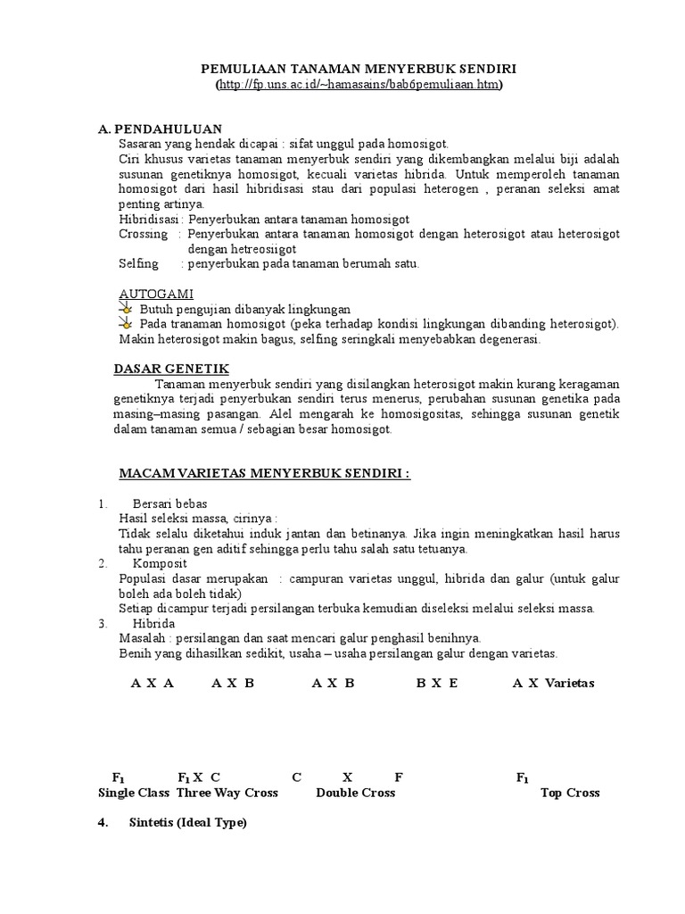 Tumbuhan tumbuhan tersebut memiliki bunga dengan ciri ciri seperti disebutkan di atas. Tanaman menyerbuk sendiri yang disilangkan heterosigot makin kurang keragaman genetiknya terjadi penyerbukan sendiri terus menerus perubahan susunan genetika pada masingmasing pasangan. Penyerbukan silang menghasilkan kombinasi satuan keturunan yang lebih beragam dari keduanya. Tanaman menyerbuk sendiri penyerbukan sendiri adalah jatuhnya serbuk sari polen ke putik dari bunga yang sama atau bunga yang berbeda dari genotipe yang sama tanaman menyerbuk sendiri adalah tanaman yang tingkat penyerbukan sendirinya lebih dari 90 mekanisme penyebab penyerbukan sendiri. Proses dari penyerbukan sendiri dengan cara buatan yaitu dengan mengumpulkan serbuk sari dari kepala sari suatu tanaman dan mengoleskan atau meletakkannya pada putik bunga yang sama atau bunga pada tanaman yang sama sebelum diserbuki. Alel mengarah ke homosigositas sehingga susunan genetik dalam tanaman semua sebagian besar homosigot.