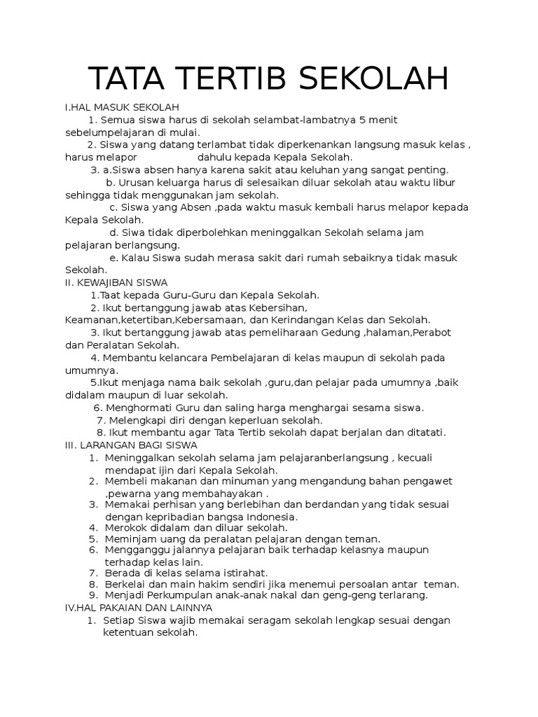 Tata tertib merupakan hal yang penting dalam tatanan kehidupan. Tata tertib ini harus dibuat secara singkat jelas dan sederhana sehingga mudah di pengerti oleh semua pengunjung. Untuk keterlambatan hadir kurang dari 10 menit masih di perbolehkan untuk masuk ke dalam kelas atau meminta izin terlebih dahulu pada guru piket. 30 contoh tata tertib sekolah sd smp sma. Berbicara tentang sekolah setiap sekolah memiliki kebijakan dan aturan main tersendiri. Tata tertib sekolah sangatlah penting dipatuhi oleh masyarakat sekolah sehingga tidak menimbulkan pro dan kontra siswa yang tidak tertib dalam mematuhi tata tertib sekolah maka siswa itu wajib dikenakan sanksi sesuai pelanggaran yang dilakukan siswa tersebut.