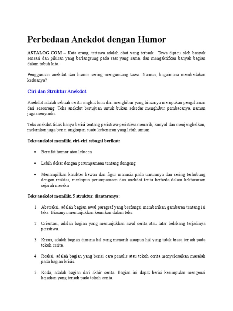 Contoh teks anekdot dan humor. Contoh teks anekdot. Teks anekdot bersifat humor atau lelucon artinya teks anekdot berisikan kisah kisah lucu atau bualan. Teks anekdot sendiri tentunya selain untuk memberi humor teks tersebut juga harus memuat amanat pesan moral ataupun kebenaran secara umum. Sedangkan teks humor adalah permainan kata yang menggelikanfreud membagi dua jenis humor yaitu1 humor polosyakni berupa sekedar permainan kata. Contoh teks anekdot lucu dan menyindir. Pada umumnya sindiran dan kritikan yang ada pada teks anekdot ialah berupa sesuatu yang ada hubungannya dengan layanan publik di bidang sosial lingkungan politik serta sosial.