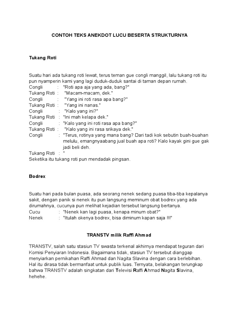 Jenis teks yang satu ini juga memiliki susunan struktur tersendiri. Teks anekdot merupakan cerita singkat biasanya lucu dan bersifat sindiran atau bahkan kritikan. Perkembangan zaman membuat teks ini kini dapat dengan mudah anda temukan di sosial media. Contoh teks anekdot singkat apa sih pengertian teks anekdot. Contoh teks anekdot panjang teks anekdot adalah jenis teks yang tentu sering anda jumpai di berbagai macam media. Teks anekdot ini juga disajikan dalam bentuk fiksi karena memang tidak semua cerita ada di dunia nyata dan juga teks anekdot ini telah dimodifikasi agar membangkitkan tawa serta selera humor.