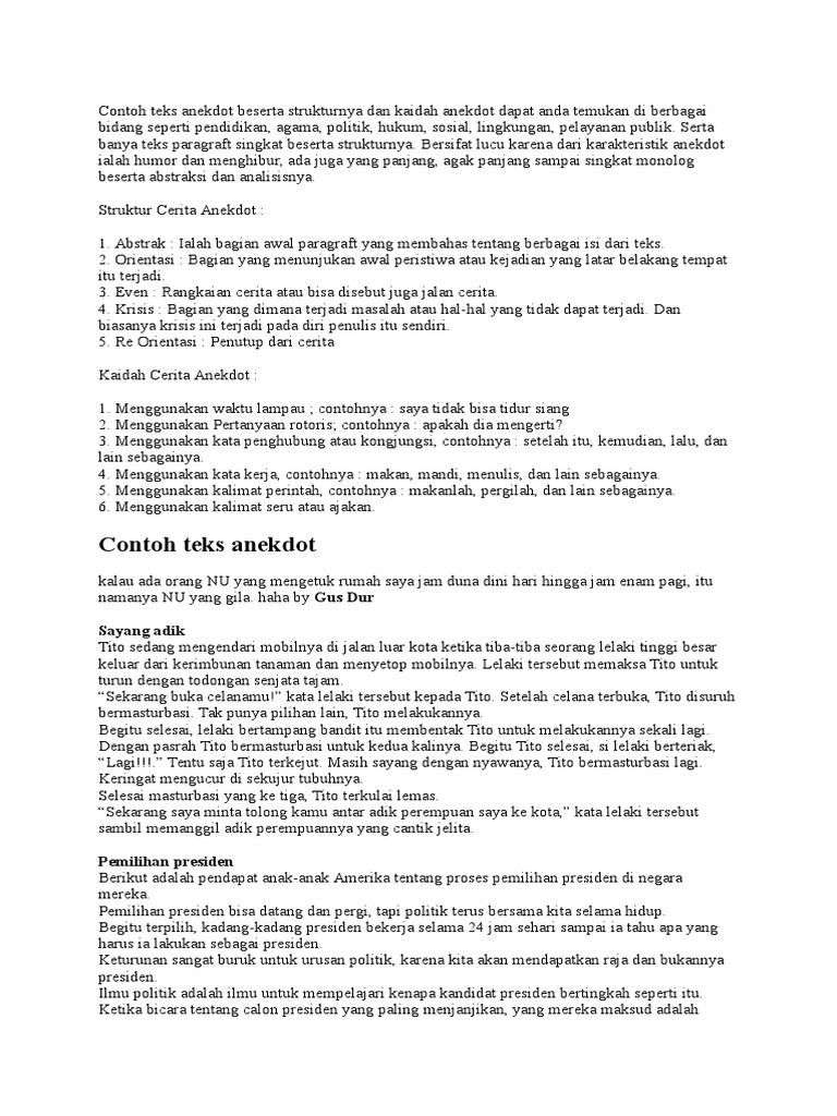 Teks anekdot oleh dosen pendidikan 2 diposting pada 26032020 26032020. Makanya teks anekdot yang sering dibuat selalu seputaran layanan publik bidang sosial hukum lingkungan dan politik. Contoh teks anekdot pendidikan. Aku berjalan menuju kelas dan anak anak masih diluar kelas. Ada banyak contoh teks. Ia juga datang dengan menghisap sebatang rokok.