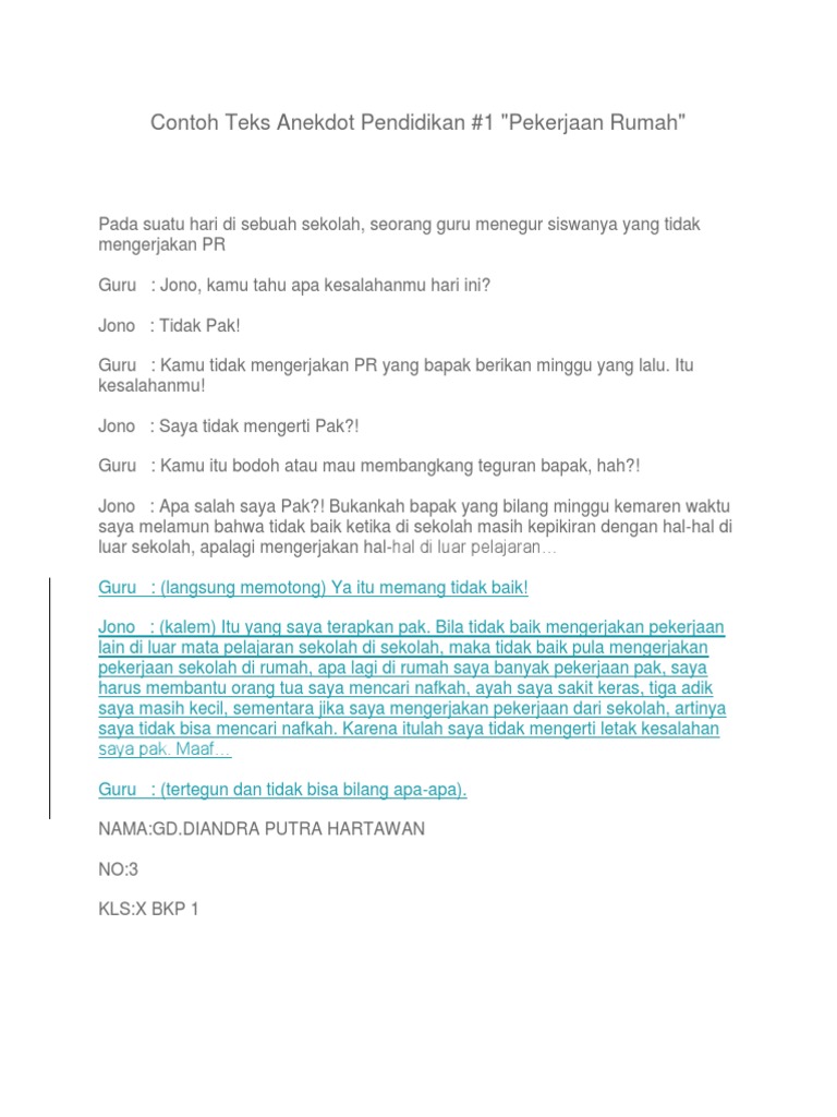 Contoh teks anekdot pendidikan. Beberapa temannya justru memberitahu andi agar tidak berbuat demikian karena nantinya akan dimarahi oleh guru akan tetapi andi justru memukul temannya tanpa rasa. Di sekolah dasar yang terletak di kota semarang sedang dalam kondisi istrirahat siang. Aku adalah seorang guru yang tidak bisa bersuara dengan keras. Aku nak ayo masuk tika apa bu tidak dengar. Contoh teks anekdot singkat apa sih pengertian teks anekdot. Daftar isiciri ciri teks anekdotstruktur teks anekdotkaidah.
