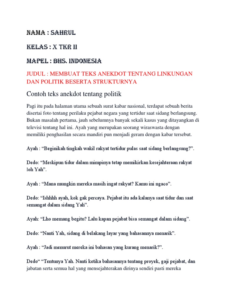 Contoh teks anekdot politik. Contoh teks anekdot banyak kita jumpai pada koran majalah atau media massa lainnya. Tak perlu berlama lama lagi berikut ini adalah beberapa contoh teks. Contoh teks anekdot ketika kita masih dibangku sekolah pasti kita mempelajari berbagai jenis teks. Biasanya yang di kritik dalam teks anekdot adalah layanan publik dalam bidang sosial hukum lingkungan dan politik. Biasanya teks anekdot ini disertai dengan karikatur dan topik yang paling sering diangkat adalah politik layanan publik sosial lingkungan serta fenomena yang sedang populer yang tengah terjadi di masyarakat. Daftar isiciri ciri teks anekdotstruktur teks anekdotkaidah.