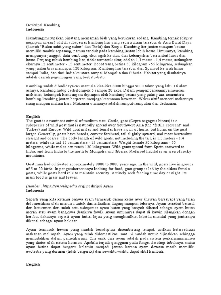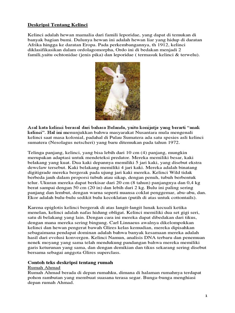 Contoh teks deskripsi tentang hewan. Semoga dapat membantu pembelajaran kalian. Contoh teks laporan hasil observasi hewan artikel ini secara khusus hanya akan membahas contoh contoh mengenai teks hasil observasi dimana sebelumnya juga pernah kita bahas mengenai pengertian struktur teks laporan hasil observasi tujuan fungsi ciri ciri dan lainnya. Hampir semua objek dapat dibuat teks deskripsi. Demikianlah contoh descriptive text tentang hewan kelinci dalam bahasa inggris dan artinya yang dapat kami berikan untuk sahabat kbi semua. Melengkapi kumpulan descriptive text dalam bahasa inggris maka kali ini kita akan membahas mengenai contoh teks daskripsi tentang gajah dalam bahasa inggris. Contoh descriptive text tentang.