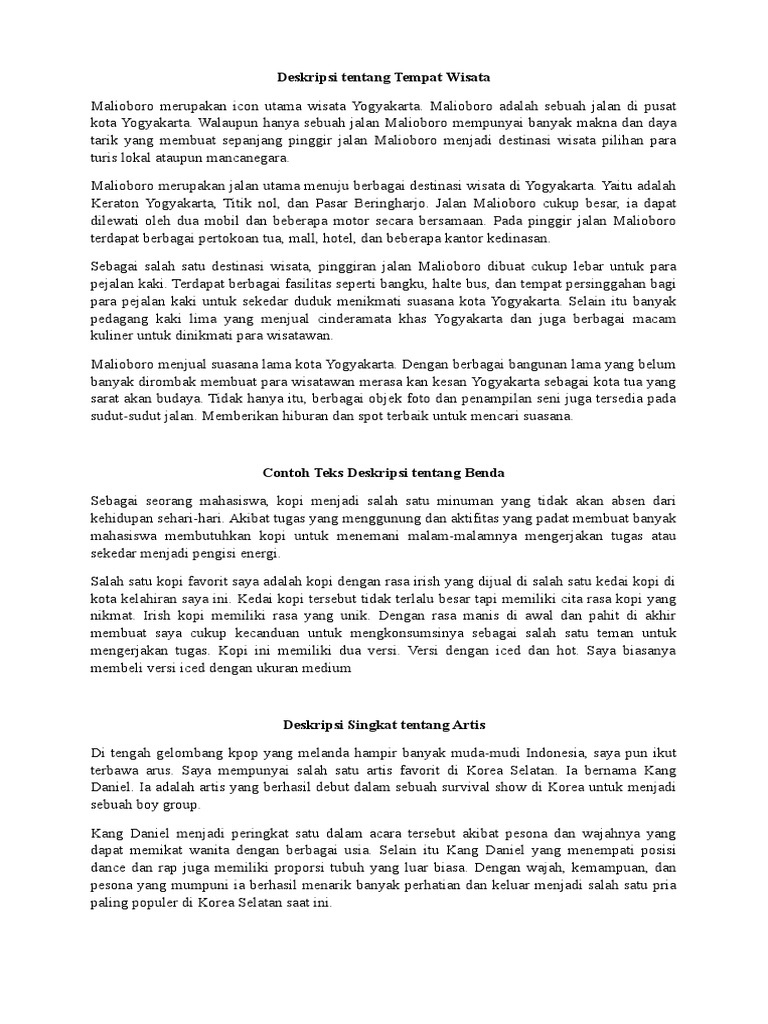 Selain itu descriptive text dalam bahasa inggris juga dapat menjadi solusi untuk. Teks deskripsi membuat pembaca seolah masuk ke dalam suasana. Baiklah saya rasa cukup sekian 5 contoh descriptive text tentang tempat wisata tourism place dalam bahasa inggris dan artinya kali ini. 2 contoh teks deskripsi tentang tempat wisata bahasa indonesia written by ivanwira tuesday july 25 2017 add comment yoo pelajar kali ini saya akan membagikan contoh singkat teks deskripsi tentang tempat wisata singkat dan strukturnya yang merupakan salah satu materi pembelajaran bahasa indonesia yang mungkin teman teman butuhkan untuk mengerjakan tugas. Semua jenis teks tersebut memiliki ciri ciri kaidah penulisan fungsi dan cara membuat yang berbeda beda. Malioboro sering disebut sebagai pusat wisata kota jogja.