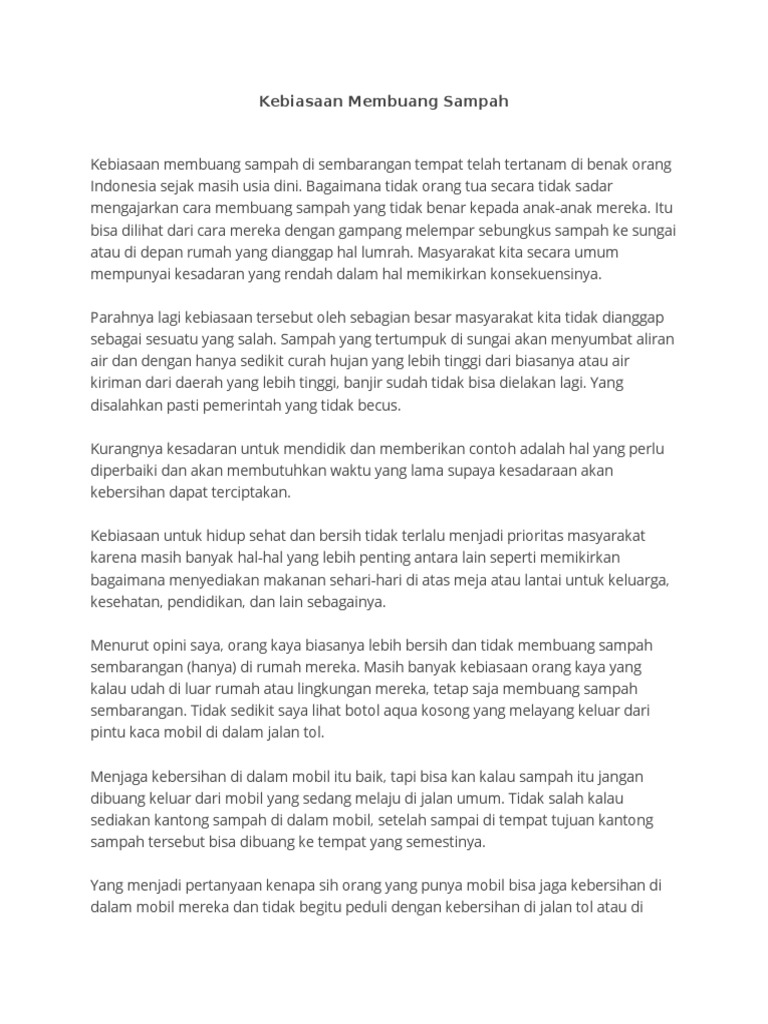 Bagaimana tidak orang tua secara tidak sadar mengajarkan cara membuang sampah yang tidak benar kepada anak anak mereka. Kebiasaan membuang sampah di sembarangan tempat telah tertanam di benak orang indonesia sejak masih usia dini. Kebiasaan membuang sampah pernyataan pendapat kebiasaan membuang sampah sembarangan telah tertanam di benak masyarakat indonesia sejak masih kecil. Namun beberapa permasalahan seperti membuang sampah sangat menarik untuk dibahas pada teks editorial. Kali ini kita akan membahas mengenai 7 contoh teks opini atau editorial adapun disini kita akan membrikan contoh teks opini atau editorial tentang banjir lingkungan sekolah sampah kesehatan dan sosial secara singkat. Blog ini membahas tentang materi penting yang ada di sekolah.
