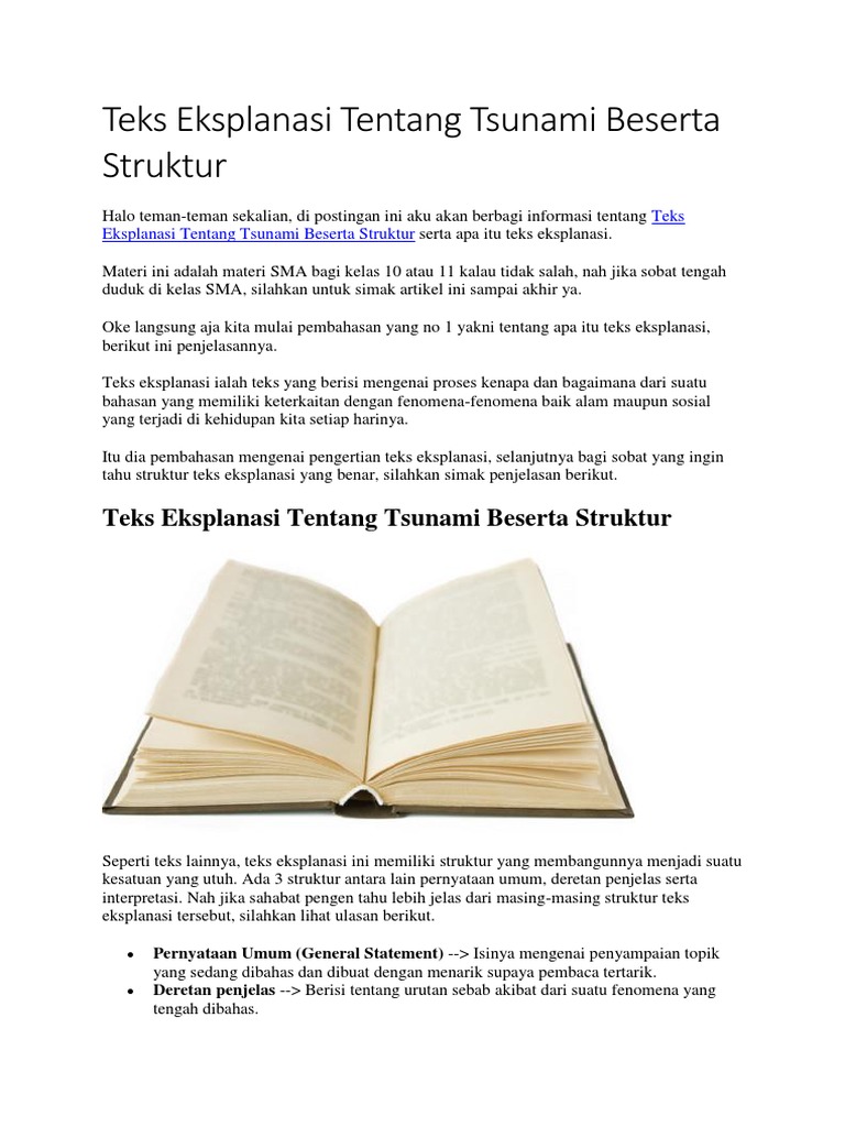 Contoh teks eksplanasi dan strukturnya. Teks eksplanasi memiliki 3 ciri ciri yang dapat memudahkan kita untuk membedakan antara teks eksplanasi dengan teks yang lainnya berikut akan penjelasan ketiga ciri ciri teks eksplanasi. Demikianlah uraian singkat terkait pengertian teks eksplanasi ciri ciri eksplanasi struktur teks eksplanasi disertai contoh teks eksplanasi singkat beserta strukturnya diawali dari contoh teks eksplanasi sosial contoh teks eksplanasi banjir contoh teks eksplanasi peristiwa alam dan lain sebagainyaterima kasih. Pernyataan umum pembuka pelangi bahasa inggrisnya rainbow merupakan suatu peristiwa optik atau meterologi berwujud cahaya yang bermacam macam warna paralel satu dengan yang lainnya di langit atau juga media yang lain. Intinya teks eksplanasi membahas tentang segala hal mengenai fenomena sosial maupun alam. Untuk pembahasan kali ini kami akan memberikan ulasan mengenai contoh teks eksplanasi yang dimana dalam hal ini meliputi contoh beserta strukturnya lengkap nah agar lebih dapat memahami dan mengerti simak ulasan selengkapnya dibawah initeks adalah teks yang menjelaskan tentang proses atau tahapan mengapa dan bagaimana terjadinya suatu fenomena atau peristiwa yang berkaitan. Demikianlah uraian singkat terkait contoh teks eksplanasi.