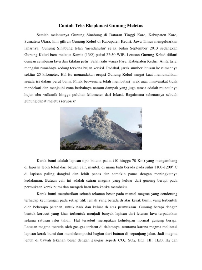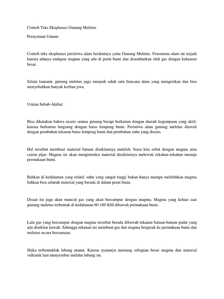 Contoh teks eksplanasi gunung meletus. 1 gunung meletus merupakan salah satu fenomena alam yang sering terjadi di indonesia. Contoh teks eksplanasi peristiwa alam berikutnya yaitu gunung meletus. Contoh teks eksplanasi selamat datang di portal hidup simpel yah pada kesempatan kali ini kita akan membahas tentang contoh teks eksplanasi. Teks eksplanasi sendiri didasarkan pada kejadian atau peristiwa yang ada di dunia. Untuk mengetahui bagaimana gunung berapi dapat meletus berikut ini akan dijelaskan secara singkat dalam explanation text tentang gunung meletus. Gunung meletus terjadi disebabkan oleh adannya endapan magma yang berada di perut bumi.