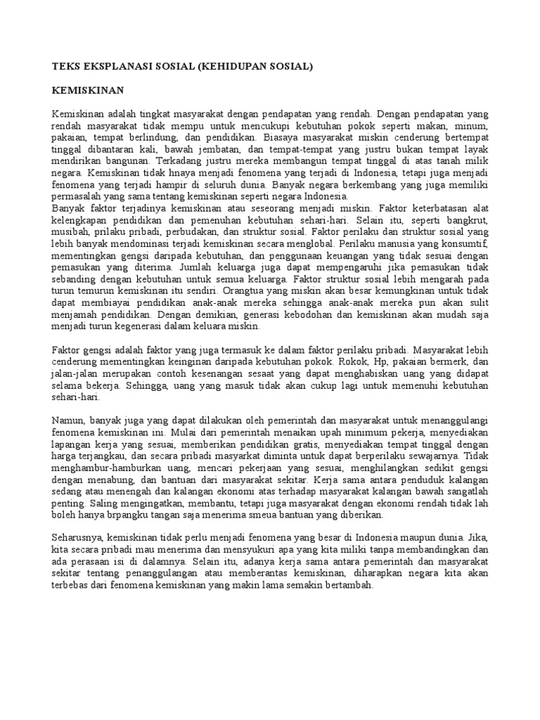 Yaitu teks yang menjelaskan secara runtut tentang sebuah kejadian beserta sebab dan akibatnya. Dengan pendapatan yang rendah masyarakat tidak mampu untuk mencukupi kebutuhan pokok seperti makan minum pakaian tempat berlindung dan pendidikan. Kemiskinan dapat disebabkan oleh kelangkaan alat pemenuh kebutuhan dasar ataupun sulitnya akses terhadap pendidikan dan pekerjaan. Berikut ini adalah beberapa contoh teks eksplanasisosial yang bisa anda gunakan sebagai referensi. Contoh teks eksplanasi sosial salah satu materi yang dibahas dalam pelajaran bahasa indonesia adalah teks eksplanasi. Kemiskinan adalah tingkat masyarakat dengan pendapatan yang rendah.