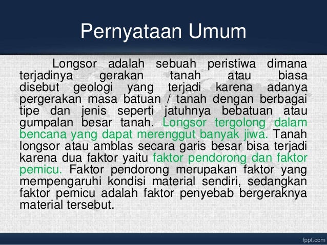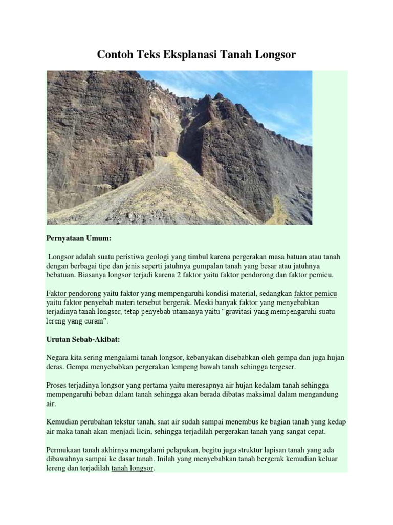 Tanah longsor merupakan salah satu peristiwa geologi yang terjadi akibat adanya pergerakan massa batuan baca. Jenis batuan atau tanah dengan berbagai macam tipe dan jenis tanah misalnya jatuhnya bebatuan atau gumpalan besar tanah. Teks eksplanasi merupakan teks yang berisi mengenai proses mengapa dan bagaimana suatu ilmu pengetahuan peristiwa alam sosial budaya serta hal lainnya bisa terjadi. Tanah longsor juga sering disebut sebagai gerakan tanah. Contoh explanation text tentang tanah longsor bencana tanah longsor sering terjadi di beberapa wilayah di indonesia khususnya di daerah pegunungan. Longsor disebut juga sebagai gerakan tanah yang ambrol atau lengser dari dataran tinggi ke dataran yang berada di bawahnya.