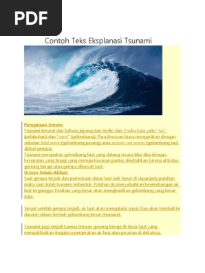 Contoh teks eksplanasi tentang tsunami. Berikut ini contoh teks eksplanasi singkat mengenai gerhana bulan lengkap dengan struktur nya. Tsunami adalah serangkaian gelombang yang terbentuk karena gempa bumi atau letusan gunung berapi di bawah laut atau didaratan dekat pantaigelombangnya yang besar dapat menyebabkan banjir dan kerusakan saat menghantam pantai. Kami secara khusus mengangkat topik pengangguran karena memang telah menjadi. Sedangkan untuk contoh yang ketiga adalah teks eksplanasi yang berbicara tentang fenomena sosial. Contoh teks penjelasan terjadinya tsunami. Tsunami adalah istilah yang berasal dari bahasa jepang terdiri dari dua kata tsu dan nami yang masing masing berarti pelabuhan dan.