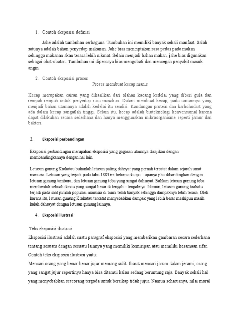 Seperti yang telah dijelaskan sebelumnya bahwa teks eksposisi tentang identifikasi menjelaskan mengenai karakteristik dari objek yang dijelaskan baik dari segi eksternal objek maupun dari internalnya. Struktur yang menyusun teks eksposisi sama dengan struktur penyusun teks editorialopini yang dimana didalamnya ada 3 struktur. Contoh teks eksposisi teks eksposisi merupakan bentuk tulisan atau karangan yang berupa paragrap yang mengandung sejumlah informasi yang valid akurat ilmiah non fiksi yang disajikan secara singkat pada dan jelas sehingga tulisan ini mampu mengjelaskan suatu pemikiran dan membawa para pembaca ke pandangan yang lebih luas lagi. Contoh teks eksposisi tentang umum. Sebelumnya kita telah mengetahui beberapa contoh paragraf eksposisi definisi yang merupakan paragraf eksposisi yang berisi definisi suatu hal. Menurut kamus besar bahasa indonesia teks esposisi.