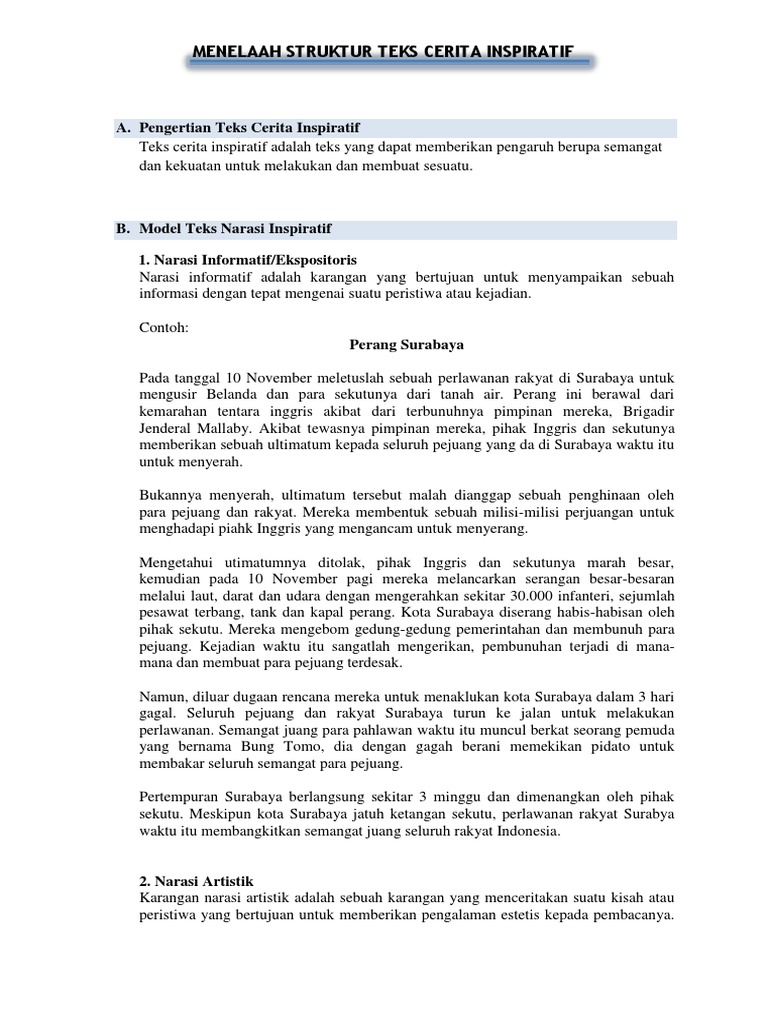Contoh teks inspiratif bahasa indonesia beserta strukturnya. Cerita yang menginspirasi seseorang berbuat. Dalam bahasa indonesia teks inspirasi merupakan salah satu bentuk teks narasi yang bertujuan untuk memberikan inspirasi ataupun kebaikan bagi pembacanya. Kisah yang diceritakan dalam teks inspiratif bisa berupa kisah. Sekian penjelasan yang bisa admin berikan mengenai contoh teks inspiratif bahasa indonesia beserta strukturnya. Posting pada bahasa indonesia ditag arti inspirasi dan motivasi cerita inspirasi ikan salmon cerita inspirasi islam cerita inspiratif 5 paragraf cerita inspiratif adalah cerita inspiratif beserta struktur ceritanya cerita inspiratif islami cerita inspiratif tentang botol cerita inspiratif tentang ibu cerita inspiratif tentang petani. Posting pada bahasa indonesia sma smp ditag arti inspirasi dan motivasi cerita inspirasi islam cerita inspiratif 5 paragraf cerita inspiratif adalah cerita inspiratif beserta struktur ceritanya cerita inspiratif islami cerita inspiratif tentang botol cerita inspiratif tentang ibu cerita inspiratif untuk anak smp cerita motivasi.