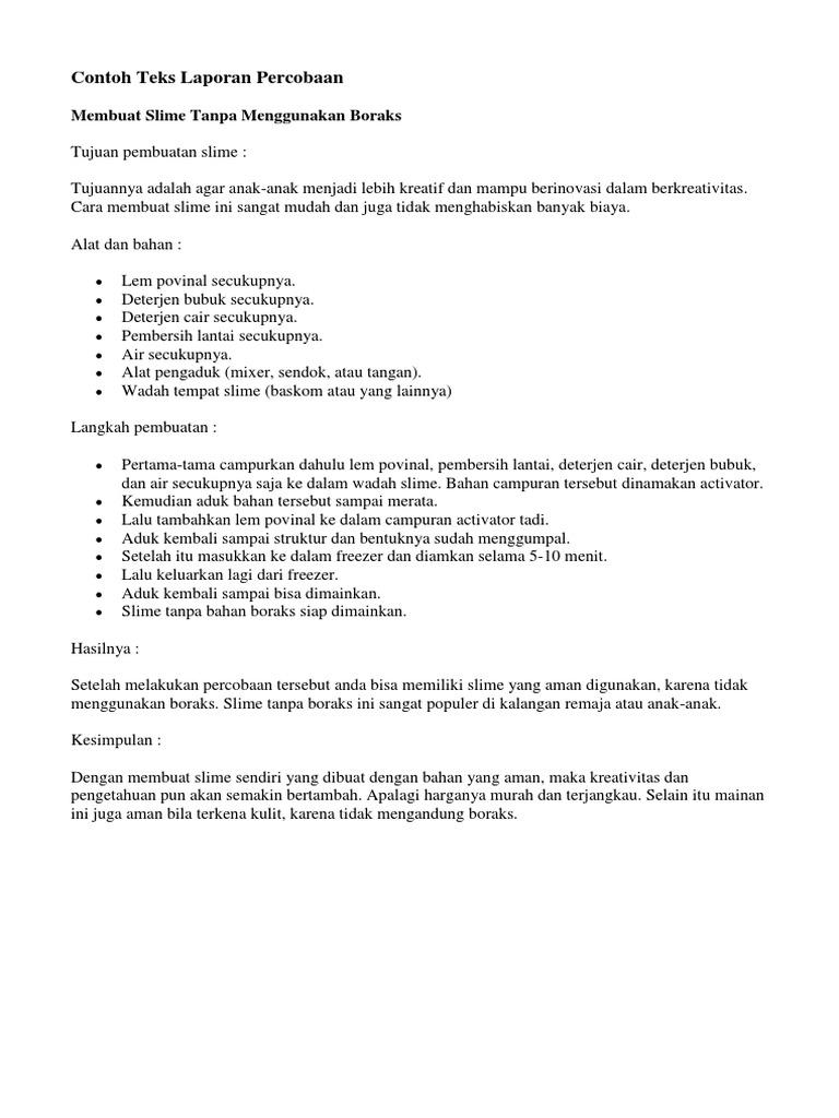 Teks laporan percobaan merupakan teks yang menceritakan tentang percobaan yang dilakukan oleh peneliti. Berikut disajikan contoh teks laporan percobaan berjudul pengaruh cahaya terhadap pertumbuhan kacang hijau yang diunduh dari laman kupdf dengan perubahan seperlunya. Biasanya kelompok yang melakukan percobaan punya dugaan hasil atau hipotesis. Mampu menentukan struktur teks hasil percobaan 2.