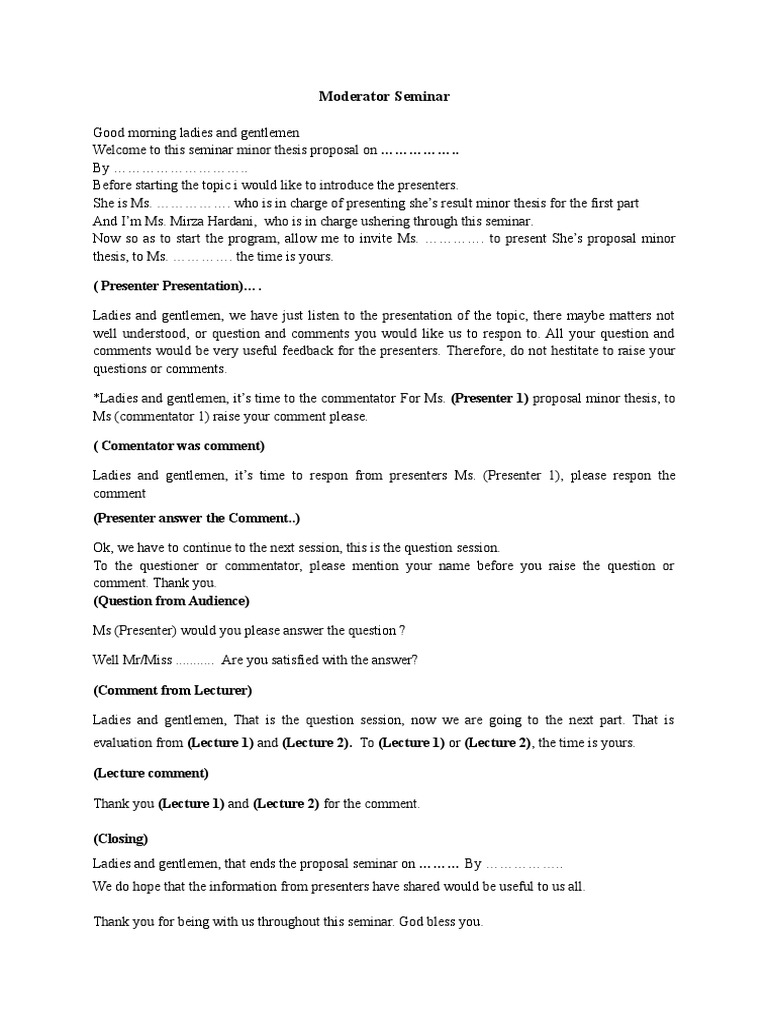 Contoh teks moderator seminar dan workshop terima kasih kepada pembawa acara yang telah memberikan waktu kepada saya. Selaku dosen pembimbing matakuliah. Format teks moderator ini saya buat dengan format sesuai dengan yang saya inginkan. Contoh yang saya barikan di atas hanya ilustrasi tapi hal itu minimal bisa jadikan acuan untuk membuat pembukaan yang lebih baik. Yang berbahagia puji syukur marilah kita panjatkan kepada allah swt atas rahmat berupa kesehatan dan sholawat serta salam semoga tetap tercurahkan kepada roslullah saw. Academiaedu is a platform for academics to share research papers.