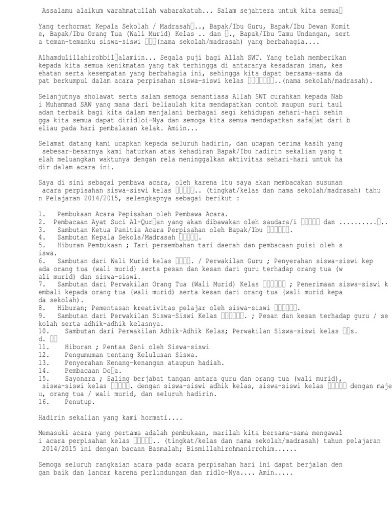 Menjelang acara perpisahan pastinya panitia sudah menyusun atau membuat susunan acara perpisahan sekolah. Oleh karena itu berikut saya share contoh teks naskah susunan acara perpisahan sekolah madrasah yang dibawakan oleh petugas khusus yakni pembawa acara perpisahan sekolahmadrasah selengkapnya sebagai berikut. Assalamu alaikum warahmatullah wabarakatuh. Contoh 1 contoh teks perpisahan kelas 9 mc assalammualaikum wrwb.