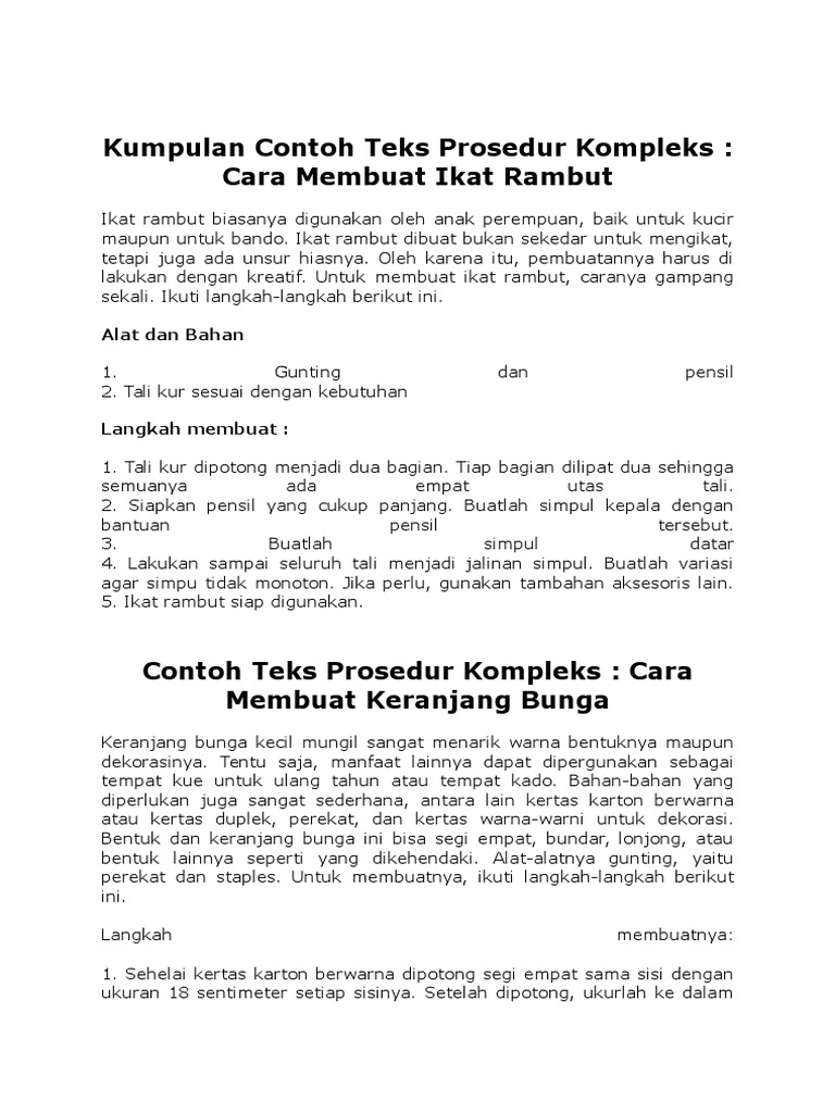 Tujuan penulisan teks prosedur kompleks ialah untuk menunjukan atau menjelaskan bagaimana mengerjakan sesuatu dengan langkah langkah yang urut. 22 contoh teks prosedur sederhana kompleks dan protokol untuk pembahasan kali ini kami akan memberikan ulasan mengenai contoh teks prosedur yang dimana dalam hal ini meliputi contoh teks prosedur sederhana kompleks dan protokol nah agar lebih dapat memahami dan mengerti simak ulasan selengkapnya dibawah ini. Nah petunjuk tersebutlah yang dinamakan prosedur. Teks prosedur kompleks dapat diartikan sebagai karya tulis yang menunjukkan informasi mengenai langkah atau tahapan yang saling berhubungan untuk menyelesaikan. Teks prosedur kompleks bertujuan untuk menjelaskan atau menunjukkan bagaimana mengerjakan sesuatu dengan langkah langkah yang urut atau. 15 contoh teks prosedur kompleks singkat terbaru 2018 teks prosedur kompleks adalah jenis teks yang menunjukkan atau menjelaskan sebuah proses dalam membuat atau mengoperasikan sesuatu yang dikerjakan melalu tahapan tahapan yang sistematis atau teratur.