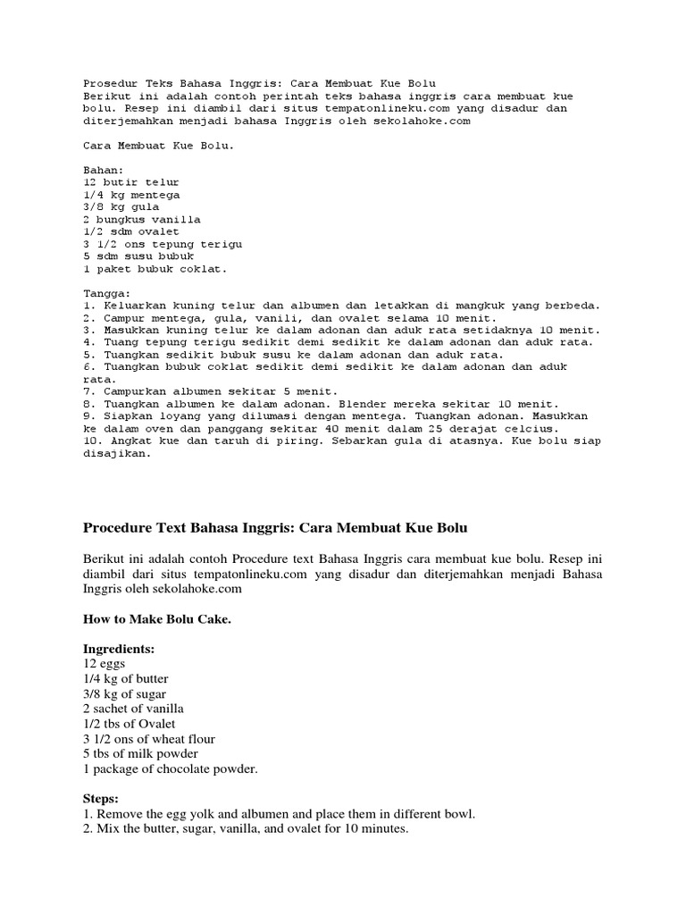 Getuk lindri terbuat dari singkong yang kerap kali disajikan dengan taburan kelapa parut sehingga rasanya semakin gurih dan enak. Teks prosedur kompleks terdiri atas banyak langkah langkah dan berjenjang kepada sublangkah pada setiap langkahnya. 10 contoh teks prosedur membuat kue bolu tujuan. Semoga dapat bermanfaat bagi para pembaca semua dalam mengerjakan tugas untuk mencari pengetahuan membuat kue. Begini resep cara membuatnya. Salah satunya ialah teks prosedur dimana jenis teks ini ialah teks yang nantinya akan membahas maupun menjelaskan tentang langkah langkah pada saat membuat dan melakukan sesuatu.