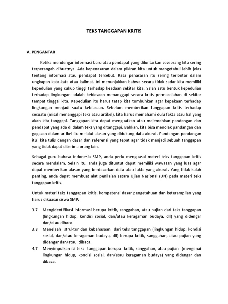 Contoh teks tanggapan kritis beserta strukturnya. Namun tentunya bebas di sini bukan berarti kita boleh mengemukakan pendapat seenak diri kita sendiri. Seperti yang kita tahu bahwa teks tanggapan kritis berisi kritik pedas mengenai suatu hal tentang kesalahannya. Deskripsi adalah bagian kedua yang berisi tentang penjabaran informasi atau pernyataan yang dapat mendukung maupun melemahkan suatu pendapat yang telah dikemukakan sebelumnya. Teks tanggapan kritis mempunyai 3 struktur penyusun yang menjadi ciri cirinya. Contoh teks tanggapan kritis sebagai manusia memang kita memiliki hak untuk mengutarakan atau mengemukakan pendapat terhadap suatu hal. Mungkin ada sebagian atau bahkan kebanyakan orang tua dan juga siswa smp seringkali dibingungkan dengan pilihan ini.