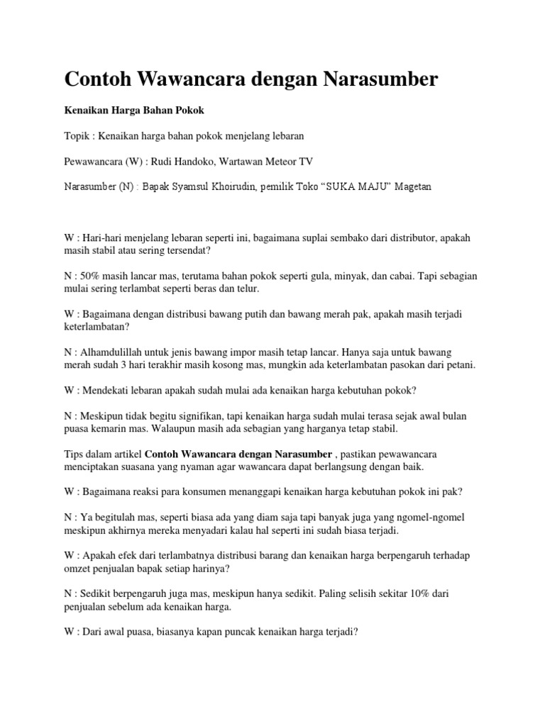 Teks ini merupakan hasil dari sebuah kegiatan wawancara yang dilakukan oleh pewawancara terhadap narasumber. Teks wawancara adalah teks yang menggambarkan kegiatan percakapan reportasi yang dilakukan pewawancara dengan narasumber. Berikut ini adalah beberapa contoh teks wawancara mengandung unsur berupa 5w 1h. Narasumber yang dipilih pun harus menguasai topik atau informasi yang akan digali. Di bawah ini adalah contoh teks hasil wawancara dengan pedagang. Pengertian macam tugas syarat dan contoh dalam membutuhkan sebuah informasi saat ini kita pastinya memerlukan narasumber untuk dapat diwawancaraidan orang yang diwawancarai tersebut yaitu narasumber yang memang harus benar benar ahli dalam bidang tertentu.