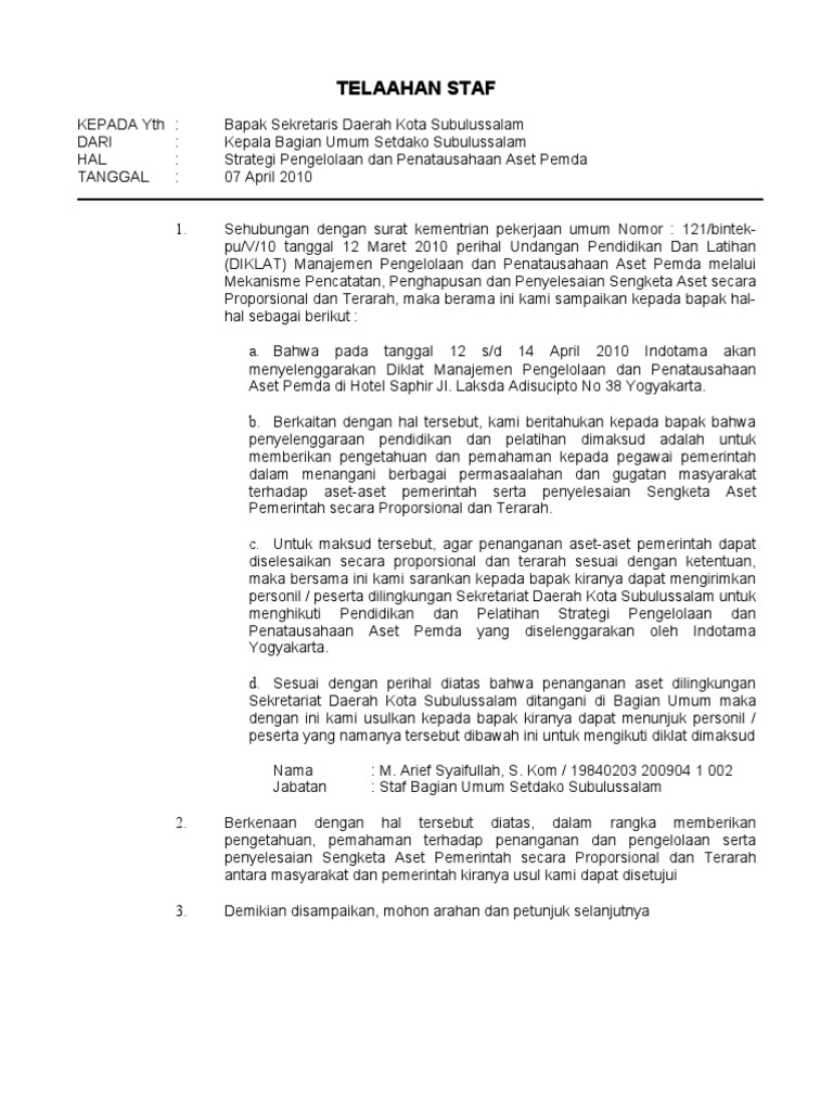Harapan saya dapat memberikan manfaat wacana masukan ataupun konsep inovatif bila para blogger juga mengalami permasalahan yang sama. Jump to page. Download as docx pdf txt or read online from scribd. Contoh telaahan staf telaahan staf penambahan anggaran contoh telaahan staf kepegawaian contoh telaahan staf permintaan barang contoh telaahan staf ke walikota telaahan staf doc contoh telaahan staf sesuai tata naskah dinas contoh telaahan staf bkd contoh telaahan staf ahli. Telaahan staf sekretaris daerah. Saya sering menerima telaahan staf dari teman teman yang ingin mengusulkan sesuatu tetapi masalahnya telaahan staf tersebut disusun tanpa sistematika yang baik ditulis tidak berurutan tidak terstruktur sehingga saya mengalami kesulitan dalam memahami telaahan staf tersebut termasuk dalam menarik logika untuk menyetujuinya.