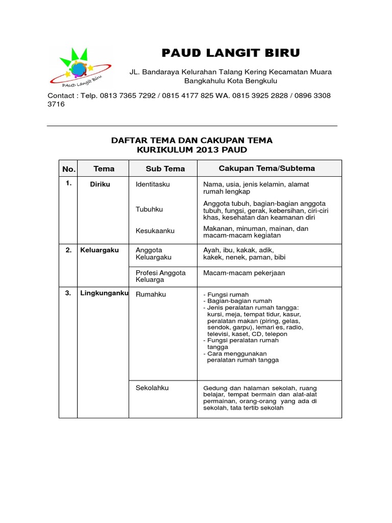 Contoh tema dan subtema. Benda hidup dan benda tak hidup di sekitarku. Meskipun demikian kita harus tetap menggunakannya dengan. Batubara emas dan perak adalah salah contoh jenis sumber daya alam yang. Aku identitas diri nama usia jenis kelaminnama ayah ibu alamat rumah anggota tubuh kepala tangan kaki cirri ciri tubuh warna kulit macam rambut bentuk badan kesukaan. Tema dan sub tema pembelajaran paud perlu disiapkan agar pendidik tidak hanya menyiapkan diri tetapi juga menyiapkan alat dan bahan main yang sesuai dengan tema. Pengertian perkembangbiakan vegetatif dan 10 contoh tumbuhan yang berkembang biak dengan vegetatif.