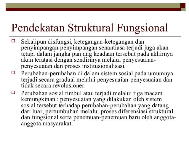 Contoh teori struktural fungsional. Keteraturan hidup ini dijalankan sebagimana mestinya yang berjalan searah dengan jarum jam manusia dan perubahan adalah hal yang mutlak sehingga tidak bisa dihindari akan tetapi manusia tetap memiliki keseimbangan sosial dengan adanya kondisi tersebut seringkali menekankan pada. Teori struktural fungsional berikut ini rangkuman makalah materi tentang pengertian teori struktural fungsional yang dibahas mulai dari pengertian jenis fungsi strukturunsur jurnal tujuan ciri makalah peran makna konsep kutipan contoh teori struktural fungsional secara lengkap. Perkembangan teori struktural fungsional. Teori struktural fungsional melihat masyarakat sebagai sebuah keseluruhan sistem yang bekerja untuk menciptakan tatanan dan stabilitas sosial. Teori ini juga disebut dengan perspektif fungsionalisme yang diciptakan oleh emile durkheim. Teori fungsional menjadi karya talcott parsons dan robert merton di bawah pengaruh tokoh tokoh yang telah dibahas diatas.