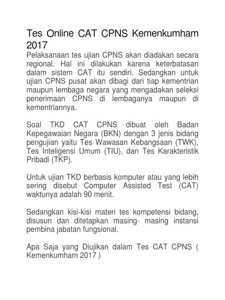 Alikasi ujian cat sumber menpan rb cpns indonesiacom tes sinonim ujian cpns tips trik mengerjakannya dan contoh so. Adapun contoh soal cpns 2019 kementerian hukum dan ham bisa anda download di akhir artikel ini. Contoh soal cat cpns kemenkumham pendaftaran cpns kemenkumham dan mahkamah agung tembus mencapai sat juta lebih pendaftar cpns hal ini disebabkan moratorium cpns yang masih diberlakukan sehingga belum dibukanya pendaftaran cpns sampai sekarangkementerian pan rb hanya membuka beberapa pendaftaran khusus untuk kementerian seperti kemarin lowongan cpns guru hanya untuk program ggd atau. Gratis download contoh soal tes cpns cat skd kemenkumham 2019 2020 klik beberapa tautan di bawah. Simulasi cat cpns kemenkumham 2017. Sebagai contoh pada simulasi cat cpns isi materinya adalah seleksi kompetensi dasar skd yang terdiri dari sub tes tes wawasan kebangsaan twk tes intelejensi umum tiu dan tes karakteristik pribadi tkp dengan jumlah soal 100 buah dan batas waktu pengerjaan 90 menit sebagaimana ketentuan tes skd sebenarnya.