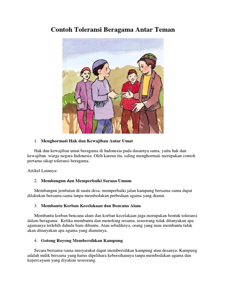 Toleransi ini tidak menghargai isi atau ajaran agama lain yang berbeda namun menghargai pemeluk atau penganutnya. Kerukukan antar umat beragama merupakan suatu kondisi dimana semua golongan agama dapat hidup bersama tanpa mengurangi hak dasar masing masing untuk melakukan kewajiban agamanya. Untuk menjaga persatuan antar umat beragama maka diperlukan sikap toleransidalam kamus besar bahasa indonesia sikap memiliki arti perbuatan dsb yang berdasarkan pada pendirian dan atau keyakinan sedangkan toleransi berasal dari bahasa latin yaitu tolerare artinya menahan diri bersikap sabarmembiarkan orang berpendapat lain dan berhati lapang terhadap orang orang yang memiliki pendapat. Pengertian toleransi toleransi ialah suatu sikap yang saling menghormati serta menghargai antar kelompok maupun antar individu di dalam masyarakat ataupun dalam lingkungan lainnya. Sikap toleransi tak hanya di wujudkan dalam umat antar bergama melainkan juga umat se agama. Artikel makalah tentang pengertian toleransi antar umat beragama fungsi manfaat tujuan ciri ciri metode contoh dan gambar.