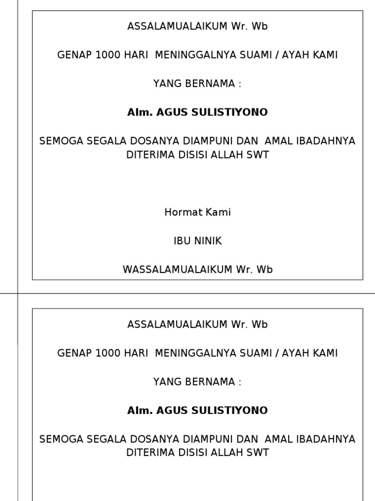 Contoh ucapan mengenang 1000 hari wafatnya. Contoh kartu ucapan aqiqah bayi pada berkat kotak nasi kartu ucapan. Contoh undangan 1000 hari orang meninggal word tinggal edit contoh undangan tahlilan file microsoft word. Untuk membuat contoh surat undangan tahlil 40 100 1000 hari haul ini lebih menarik ts udah nambahin border dan sedikit hiasan di sudutnya cek preview nya gan. Download contoh surat undangan tahlilan siap edit gratisiana net. Contoh ucapan happy wedding dalam bahasa inggris. Contoh surat undangan tahlil 40 100 1000 hari haul.