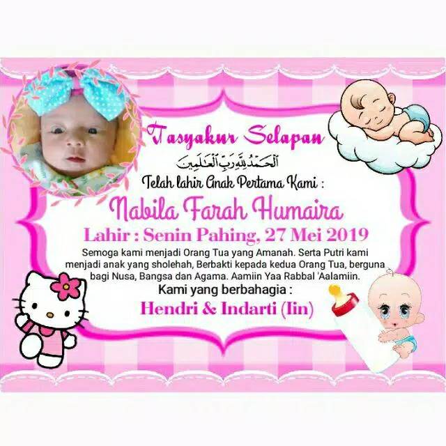Kartu ucapan khitanan anak share on whatsapp facebook pinterest twitter stumble it digg this linkedin delicious. Contoh kartu ucapan aqiqah bayi pada berkat kotak nasi. Layout menyesuaikan dengan contoh diatas yah. Pada artikel sebelumnya belajar office sudah memberikan contoh format penulisan syukuran kelahiran bayi pada. Begini nih penampakan hasilnya. Pada pelaksanaan tasyakuran kelahiran anak biasanya orang tua akan menyertakan kartu ucapan aqiqah bayi pada berkat kotak nasi yang diberikan kepada tamu undangan untuk di bawah pulang ke rumah.