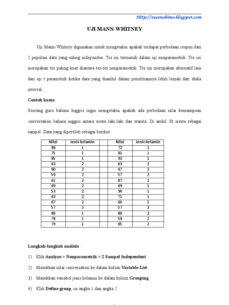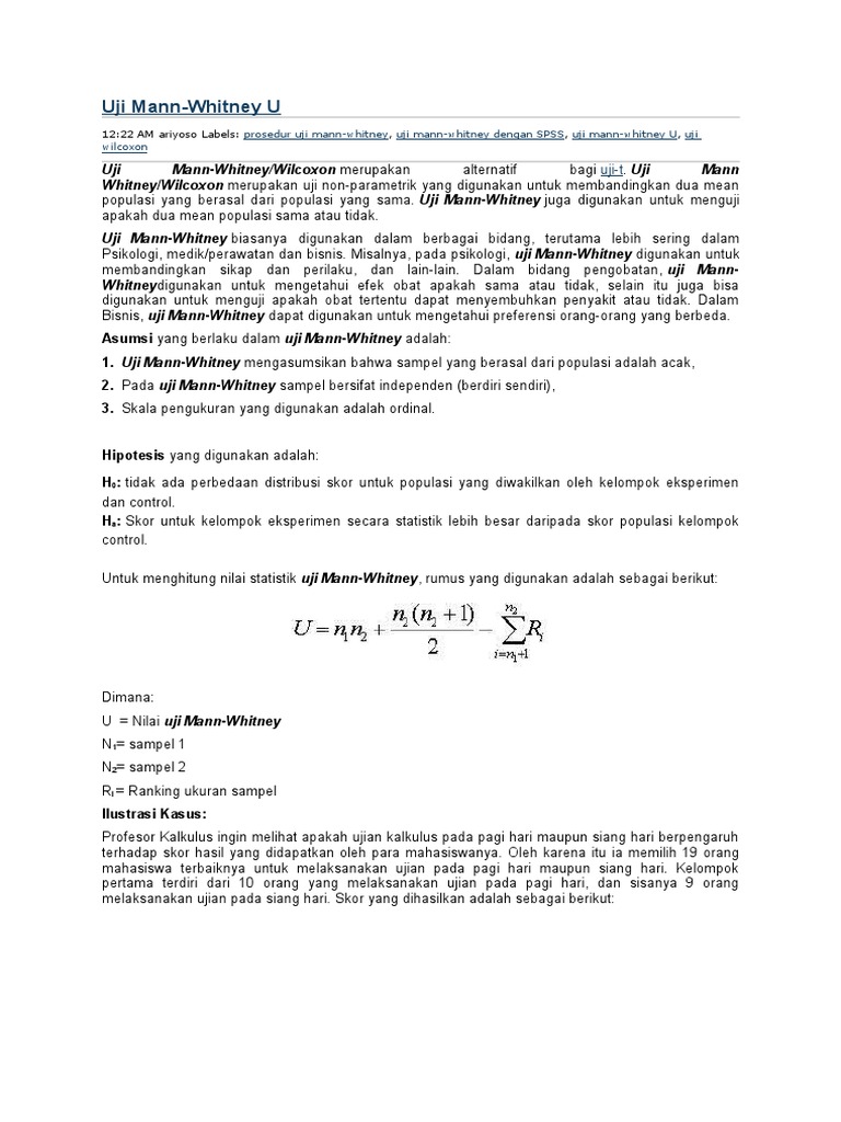Contoh uji mann whitney. Uji ini dikembangkan oleh hb mann dan dr. Berdasarkan definisi di atas uji mann whitney u test mewajibkan data berskala ordinal interval atau rasioapabila data interval atau rasio maka distribusinya tidak normal. Mann whitney u test adalah uji non parametris yang digunakan untuk mengetahui perbedaan median 2 kelompok bebas apabila skala data variabel terikatnya adalah ordinal atau intervalratio tetapi tidak berdistribusi normal. Dalam uji beda ini sampel yang digunakan tidak harus sama jumlahnya. Berikut cara baca hasil uji mann whitney. Uji mann whitney atau lebih dikenal dengan u test.