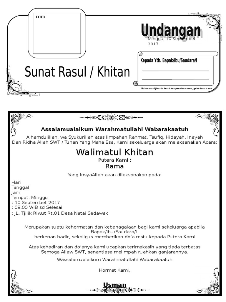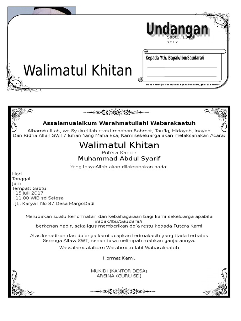 Contoh undangan khitanan ms word. Mohon maaf apabila banyak kesalahan dalam penulisan artikel atau informasi tersebut yang ada kaitannya dengan format. Format undangan khitanan yang bisa di edit ini bisa langsung dibuka di microsoft word selain itu contoh undangan khitanan anak contoh undangan walimatul khitan dan contoh undangan tasyakuran khitanan bisa kamu download gratis kok. Informasi undangan yang kami bagikan semoga menjadi informasi terbaik dan bisa benrmanfaat untuk semua khususnya informasi tentang contoh uleman khitanan basa sunda ms word terbaru 2020 yang semuanya kami kumpulkan dengan serapih mungkin. Undangan khitan atau walimatul khitan harus mengundang dengan cara datang. Download undangan microsoft word berikut ini kami akan share beberapa contoh format atau file undangan dari berbagai macam acara seperti walimatul ursy walimatul khitan selapanan tahlil 40 hari 100 hari pendak 1 dan 2 seribu hari haul walimatul aqiqah karena sering kali kita kesulitan untuk mencari format atau contoh undangan seperti walimatul haji tingkepan acara rapat semuanya. Hari ini team gelas pecah iseng membuat format undangan khitanan terbaru yang juga bisa digunakan untuk undangan walimatul khitan ms word doc psd cdr.